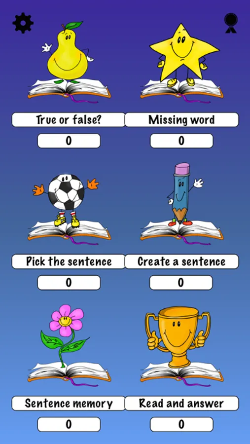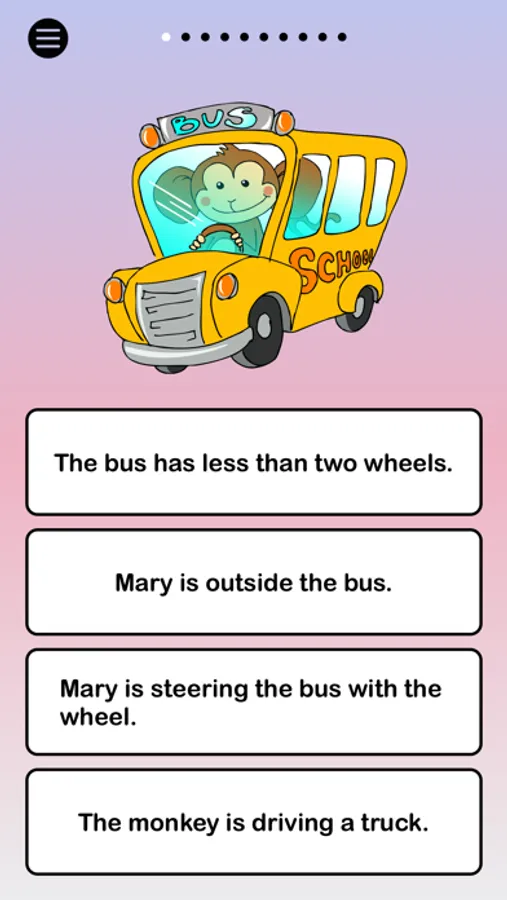 Practices the children's reading skills. A statement is presented and the task is to decide if it is true or false judging from the picture that is shown.