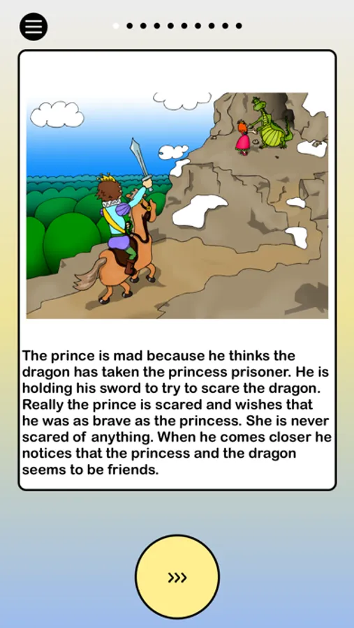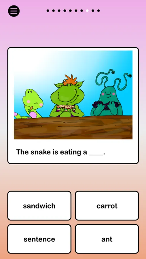 A combined exercise that practices the reading flow as well as reading and word comprehension. A shorter text is presented along with a picture. When the child has read the text and chooses to continue a question is presented with three answer alternatives based on the read text.