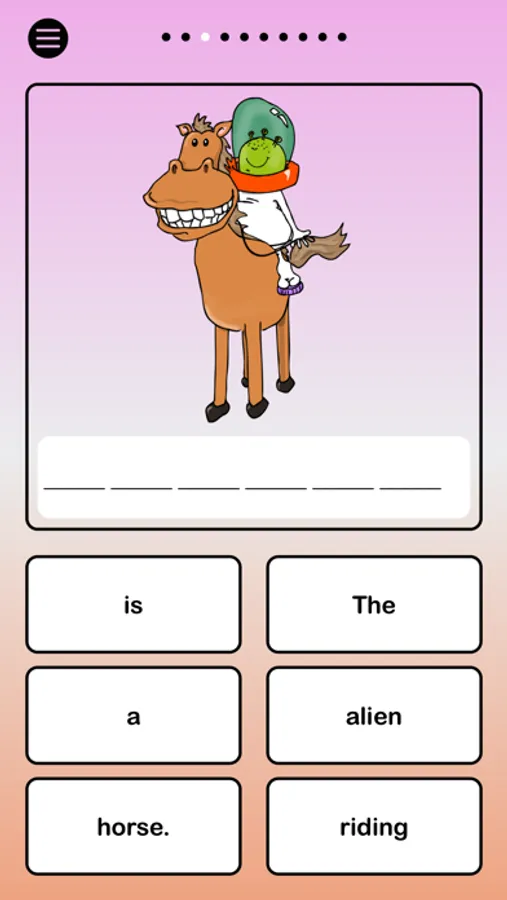 Practices the children's understanding for sentence structure with capital letter and punctuation as important parts. A picture is shown along with between three and six words. The task is to build a correct sentence from those words.