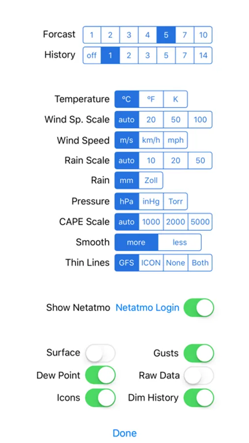 Wetter is an app which draws beautiful meteograms. A meteogram is a time plot that uses data for a specific location on the ground. It can display past weather conditions up to the current time forecast and predict weather out into the future.