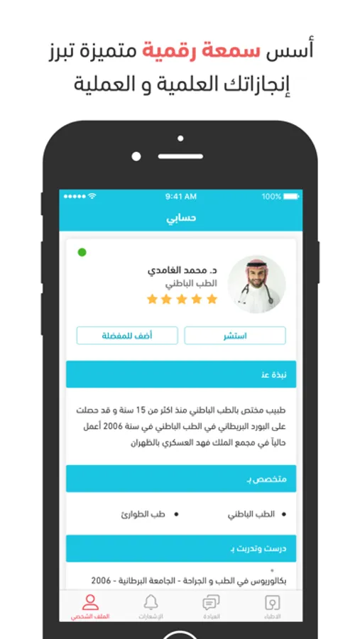 1. بعد أن تسجل معنا ونقوم بالتحقق من شهاداتك ورخصتك الطبية، تستطيع أن تدون خدماتك وانجازاتك والشهادات التي حققتها عبر السنوات.