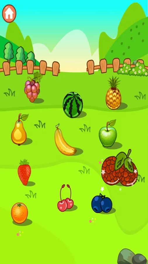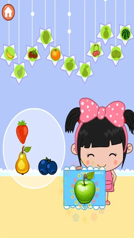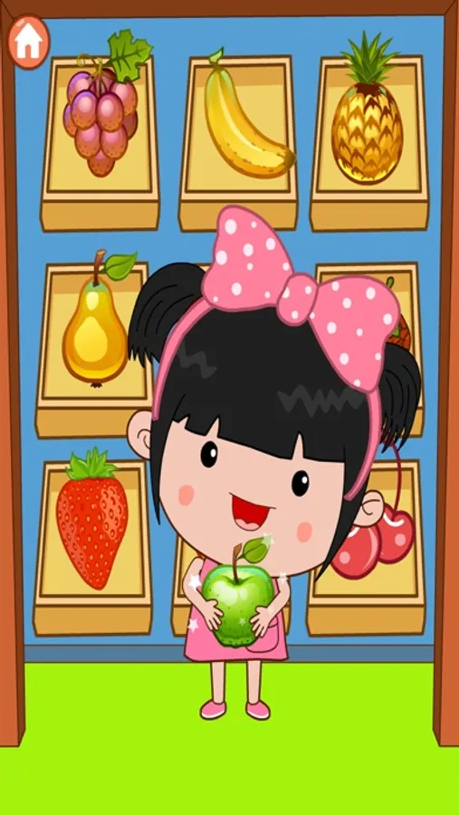 丫丫认水果分为三部分,第一部分是认识水果,点击水果会语音告诉你水果的名称;第二部分是超市买水果的小游戏,如果答对了丫丫就会抱着水果开心的笑;第三部分是答题,依照提示将所有的水果都回答正确,丫丫就会在美妙的音乐伴奏下安静的睡觉