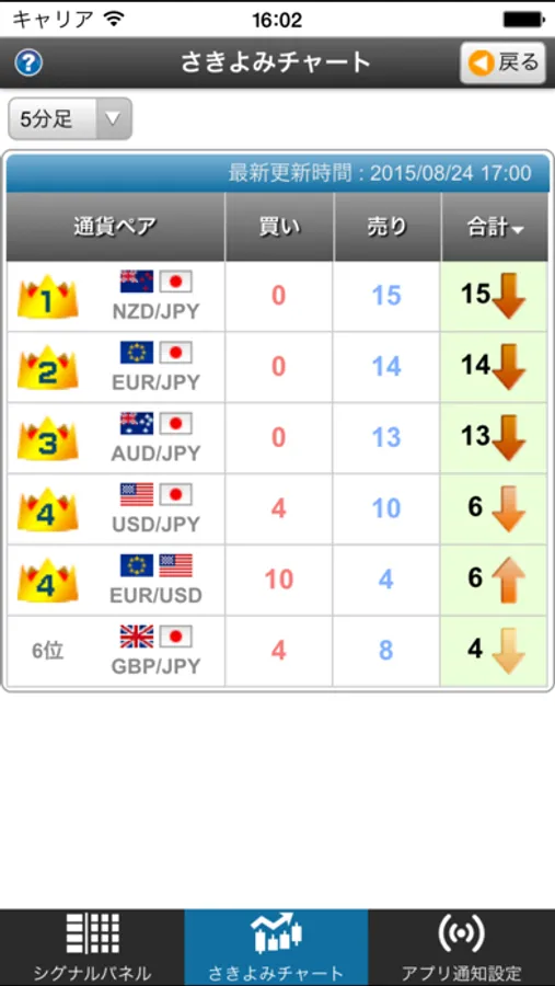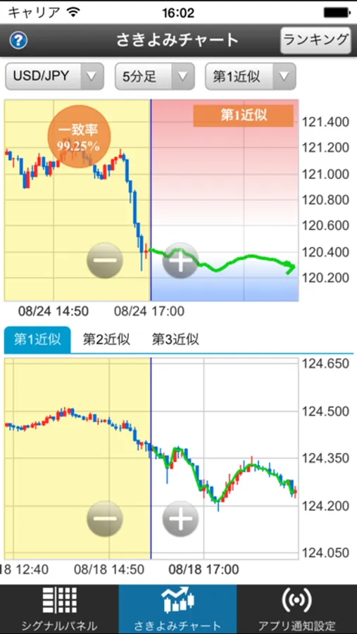 過去のデータから直近のチャートの形状と同じような値動きを自動で見つけ出し、近似チャートを3つまで表示、そこから未来の値動きを予想します。また、シグナルパネルの内容を総合的に判断してテクニカルランキングを表示します。