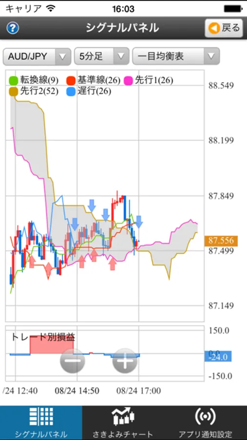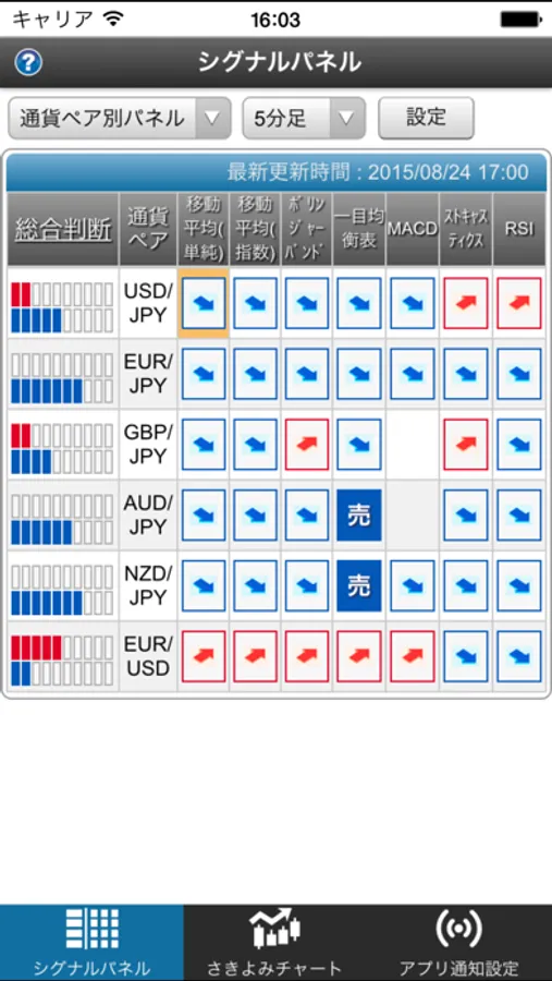 テクニカル指標を分析し、その結果を「売・買」のシグナルで表示。現在の相場のトレンドを簡単に把握することができ取引のタイミングを計るための指標にすることができます。また、シグナルに基づいて取引した場合の売買シミュレーションも表示しています。
