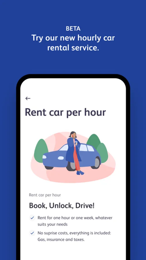 • Rent a car by the hour - Booking, Paying, unlocking and locking the car, all from the app.