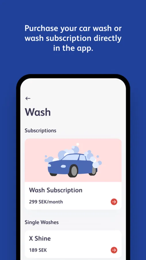 • Buy a car wash subscription or single wash in the app, and wash without leaving your car