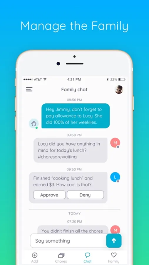 With Homey you can pay kids commissions based on chores they do around the house like taking out the trash, cleaning their room, or mowing the grass. And you can also set responsibilities that are required to teach kids that everyone needs to contribute to the household.