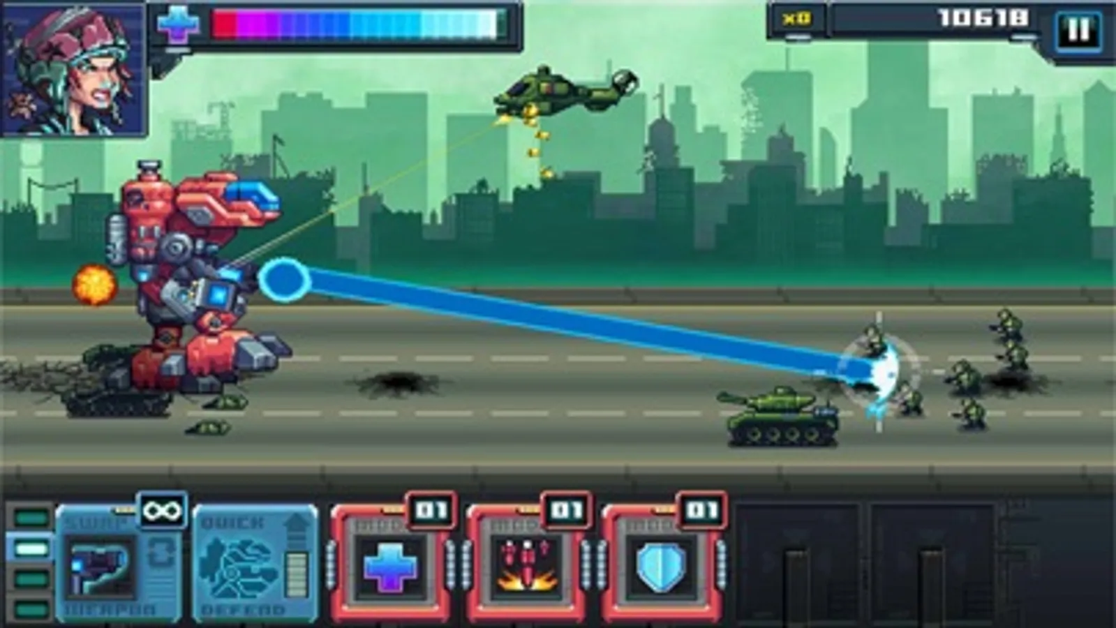 You control a giant humanoid warrior! The General has sent his army to eliminate you! Get ready to take on countless waves of enemies, including ground troops, helicopters, tanks and more!