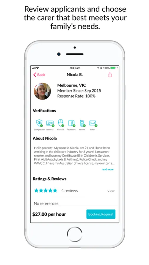All our babysitters and nannies have a verified and constantly monitored Working With Children Check, a government issued background check which includes a national criminal history check and a review of workplace misconduct records.
