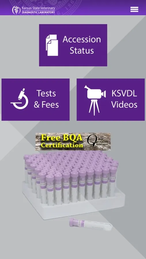 Track your samples from accessioning through final test results at the Kansas State Veterinary Diagnostics Lab. Designate how you receive push notifications as samples are accessioned into the lab, when individual test results become available, and when accession results are finalized. View and share results in PDF format.