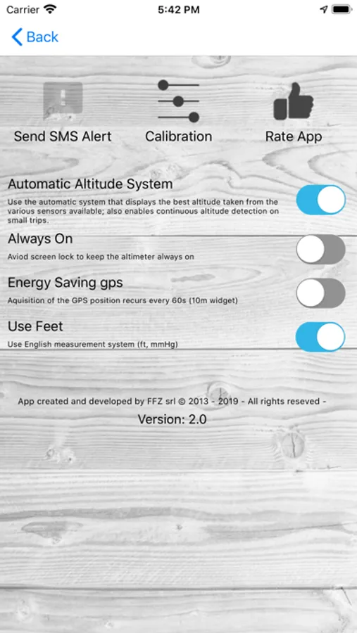 You can see the altitude in meters or feet and calibrate the altitude from the settings panel.