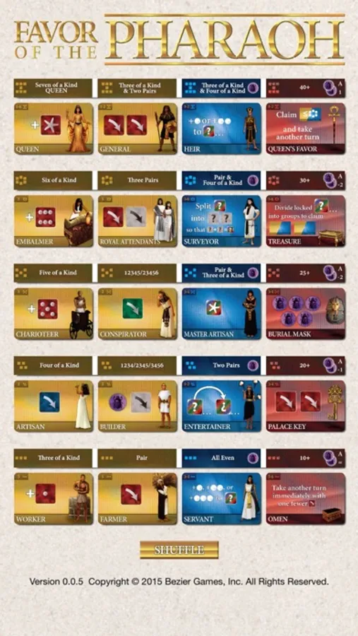The Favor of the Pharaoh companion app provides the default setup for tiles and level bars, and then with a tap of the Shuffle button, randomizes the tiles and level bars. The app chooses from all of the possible 50 different tiles, enabling billions of possible combinations.