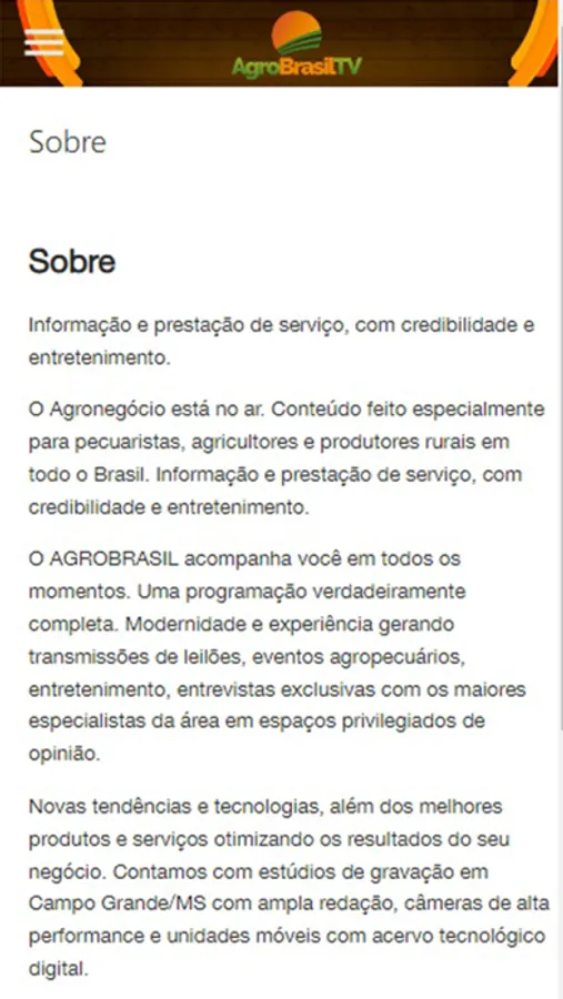 Você tem o AGROBRASIL ao alcance de suas mãos e acompanhada de onde estiver através do sistema AGROBRASIL MOBILE. Assista nossas atrações na telinha do seu Iphone, Ipad. Você está sempre com o AGROBRASIL e o AGROBRASIL sempre com você, isso chamamos de PARCERIA. Agronegócio é, literalmente, “o nosso negócio”‘. A voz e a cultura do produtor rural alcançando os quatro cantos do Brasil.