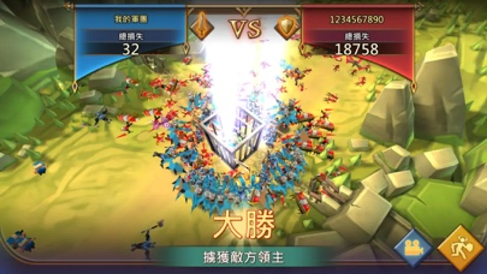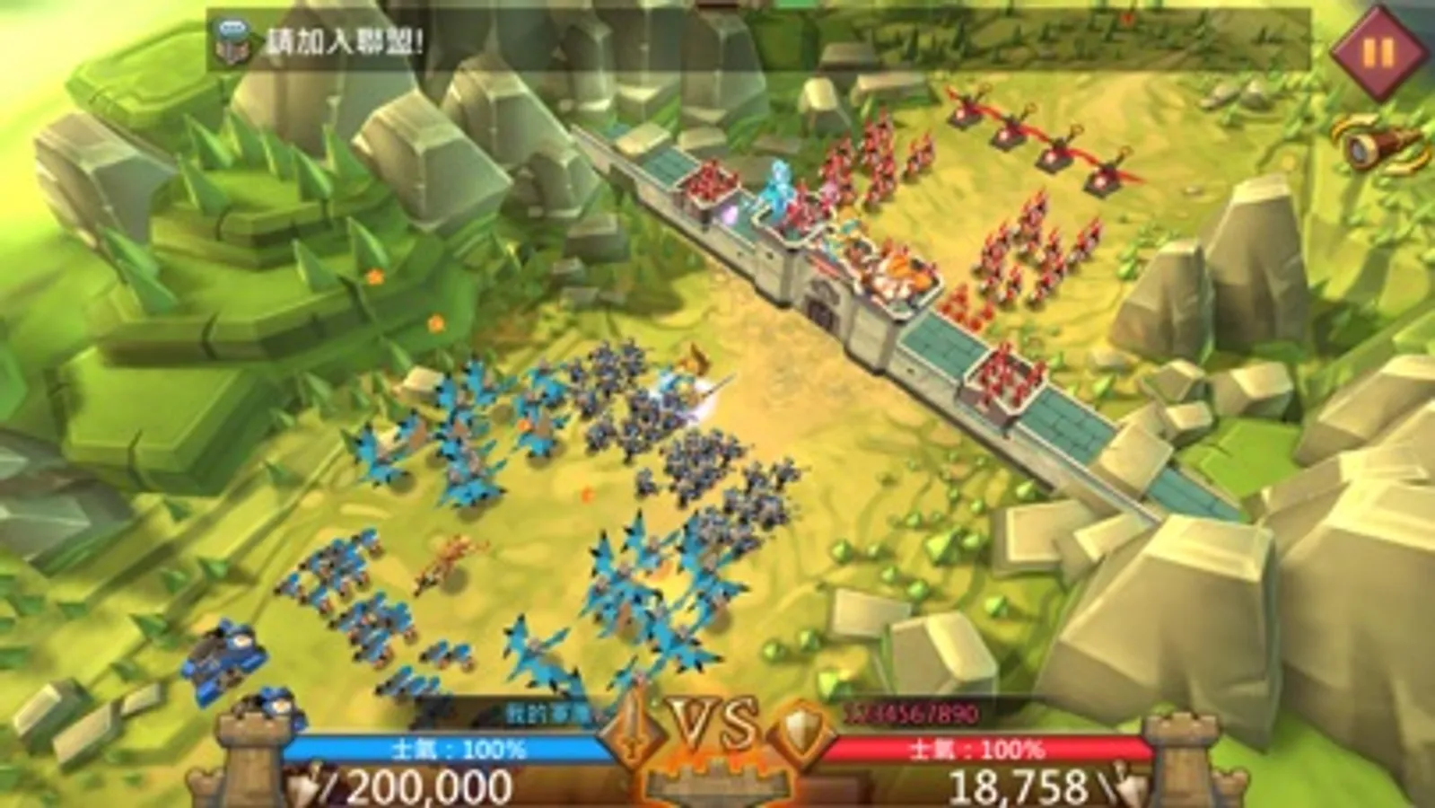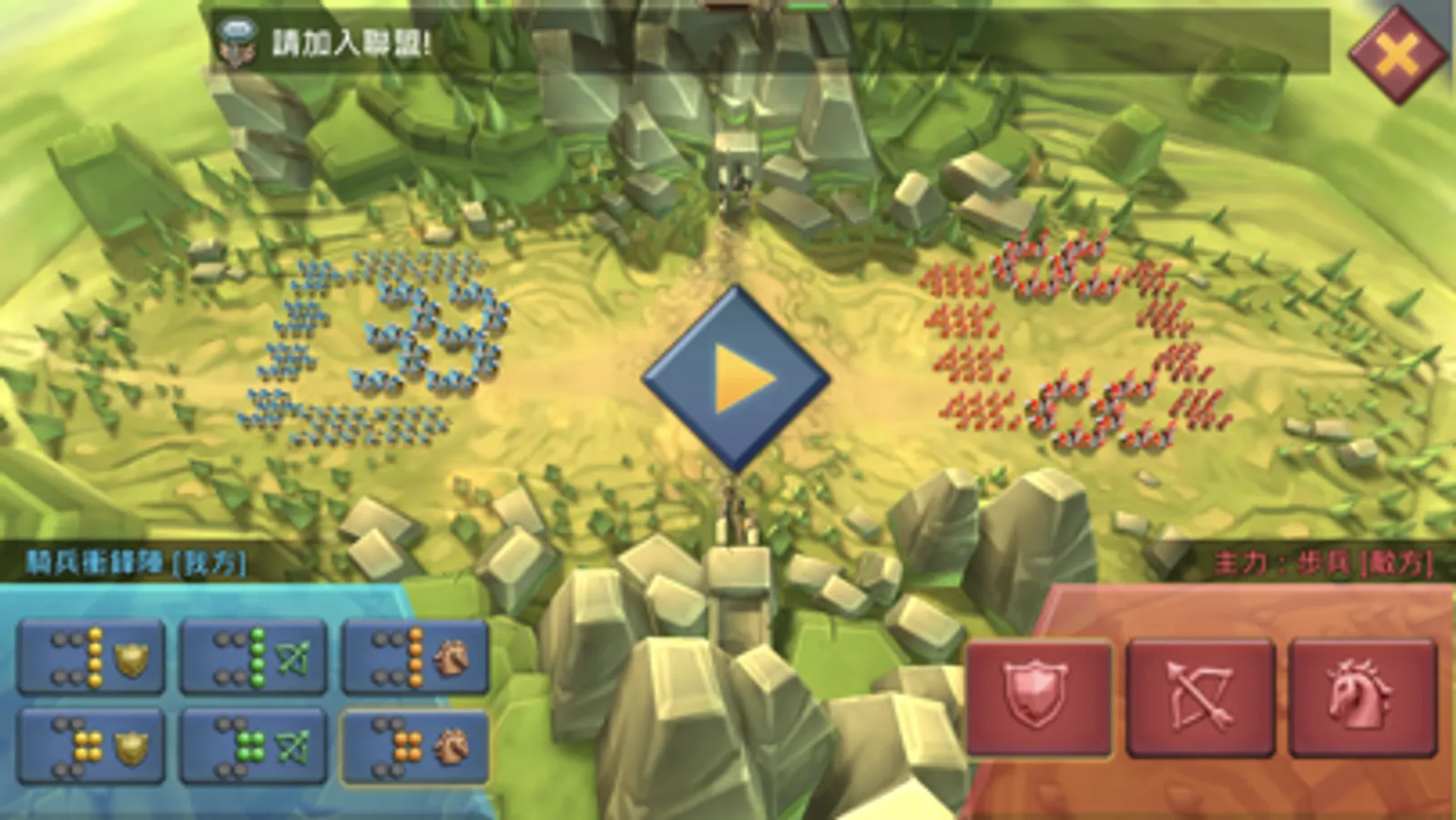 兵種分為騎兵、步兵、弓兵、投石車等,特點鮮明又存在著致命的弱點。只有情報偵察到位,策略明確,同時適時地配合英雄的軍團技能,取長補短,方可決勝千里。
