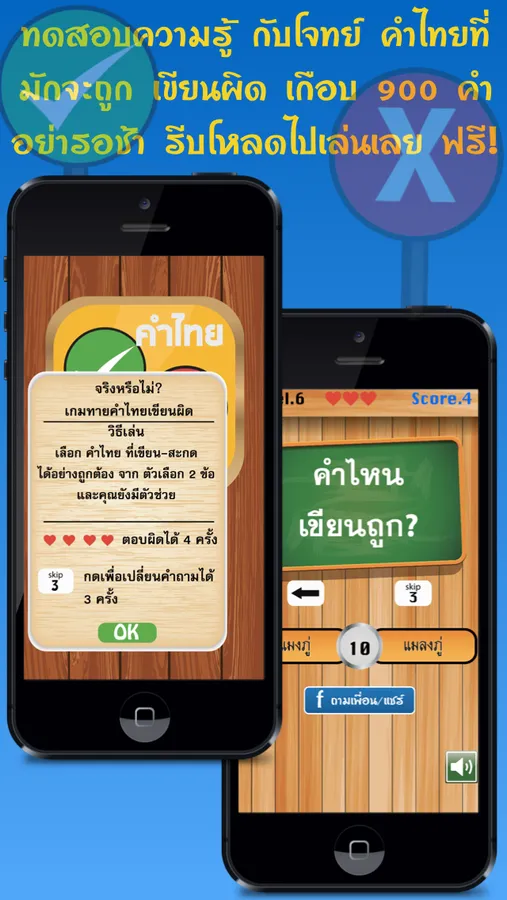 เลือกคำไทย ที่เขียนและสะกดได้อย่างถูกต้อง จากตัวเลือก 2 ข้อ และคุณยังมีอีก 2 ตัวช่วย