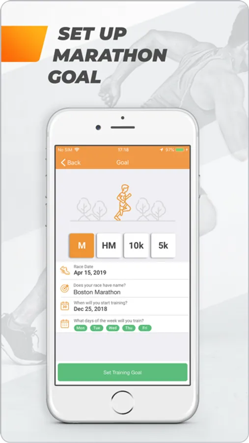 Just set a race goal (M, HM, 10K, 5K), select the number of training days, and the date of the race. The app asks you to run time trials or enter your most recent 5K result. Based on that, Marathon Runner will provide you with an optimal training plan and pace for your running workouts according to your current ability level.