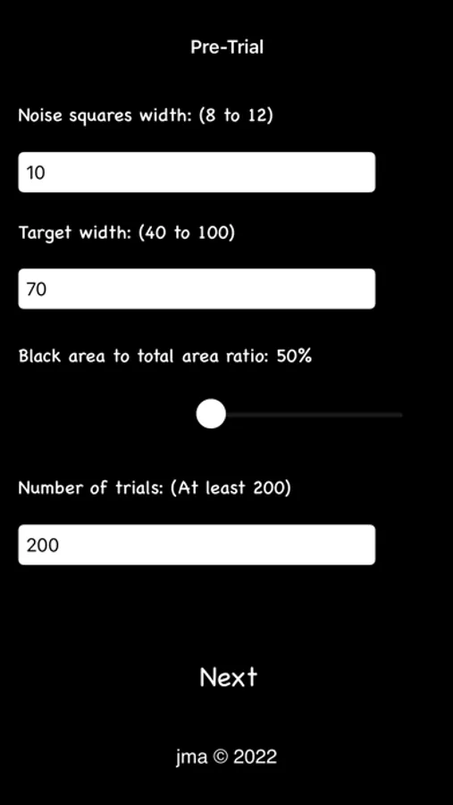 The Pre-Trial stage is where you can configure the trial's settings to your liking. You may adjust the Noise Square Width, Target Width, and Black area to the total area ratio in order to modify the difficulty. Please note that all three settings have bounds, if you set a value outside the bounds, then you will receive a warning, and the settings will reset to the default values.
