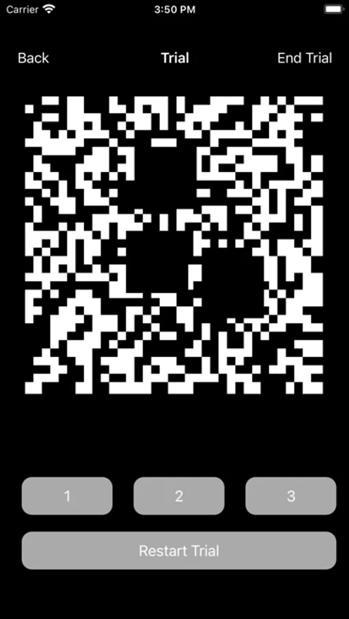 The trial stage is the bulk of the application. When ready, you may start the test by pressing the tab 'Start Trial' at the bottom. After the tab is pressed, a visual stimulus will appear on the screen. The visual stimulus is composed of black and white squares embedded in a noisy background. You must count the number of Target squares as fast as you can and press the tab with the correct number: |1| |2| |3|. Once a tab is pressed, another stimulus appears. This sequence is repeated until the number of trails set is met. A minimum number of trials (5) is required to obtain reliable data and contribute to the research. However, you may finish the test at any time by pressing the tab 'End Trial'.