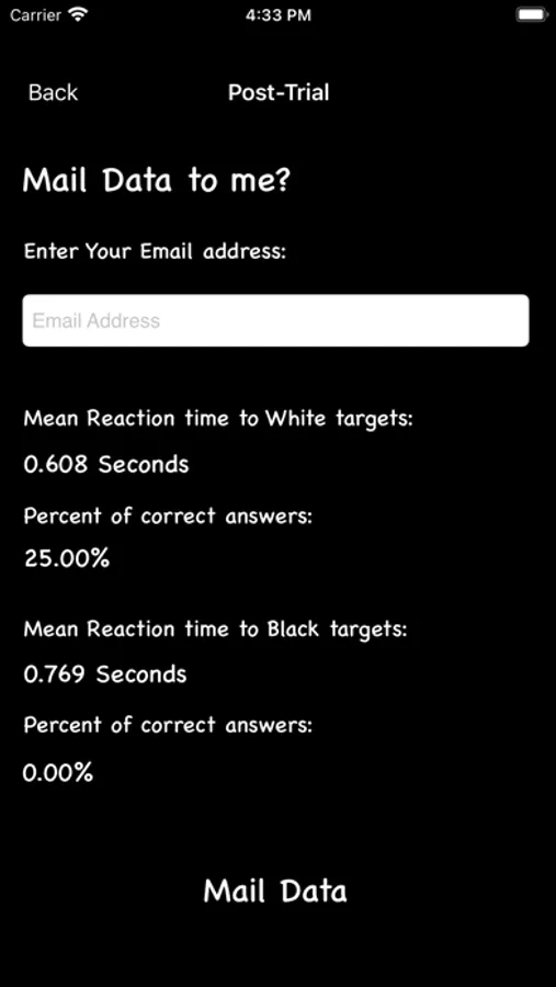 The post-trial is the final stage of the application. Here, you can see how well you did during the test. If you completed 5 or more trials, then there is an option to mail the data to our laboratory and to the user's email address. The data is mailed in the form of a data sheet (.csv file) that contains information about the data collected (e.g., reaction times and correct responses for the individual trials) and information about the variables selected for the test (the configuration done in the Pre-Trial). Please check our privacy policy for any concerns on data collection and processing. After the data is mailed, the app provides a performance score based on the speed and accuracy of the count. The score ranges from 0 to 100 (100 being the best performance). Thank you for downloading our app and contributing to our research!