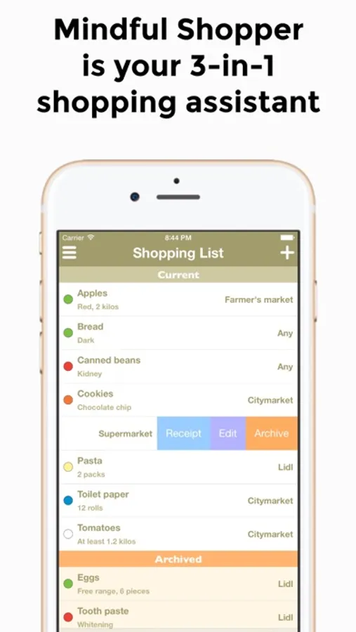 Mindful Shopper is a powerful and feature-rich, yet intuitive and easy-to-use shopping assistant. It allows you to create and organize shopping lists, calculate receipts while you are shopping to avoid any surprises at the cash register and it also features five different calculators to help you while shopping and eating-out.