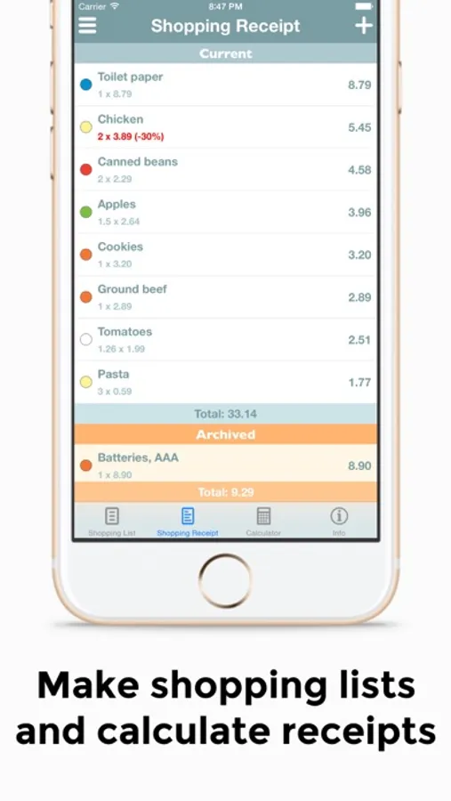 Calculate receipts while you are shopping! Mindful Shopper can also calculate prices for weight and amount as well as discounts. No more surprises at the register! You can sort items by price and archive items to see the effect on the final price. Become a mindful, smart and efficient shopper.