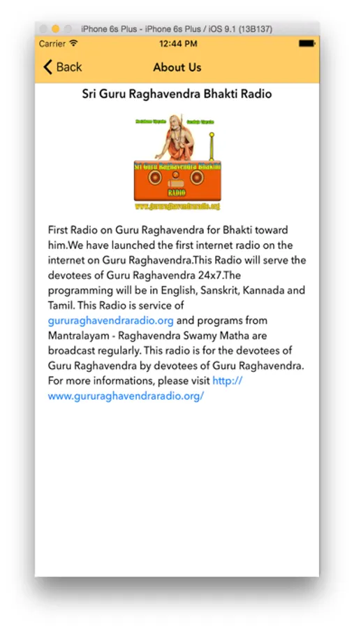 First Radio on Guru Raghavendra for Bhakti toward him.We have launched the first internet radio on the internet on Guru Raghavendra.This Radio will serve the devotees of Guru Raghavendra 24x7.The programming will be in English, Sanskrit, Kannada and Tamil. This Radio is service of gururaghavendraradio.org and programs from Mantralayam - Raghavendra Swamy Matha are broadcast regularly. This radio is for the devotees of Guru Raghavendra by devotees of Guru Raghavendra.