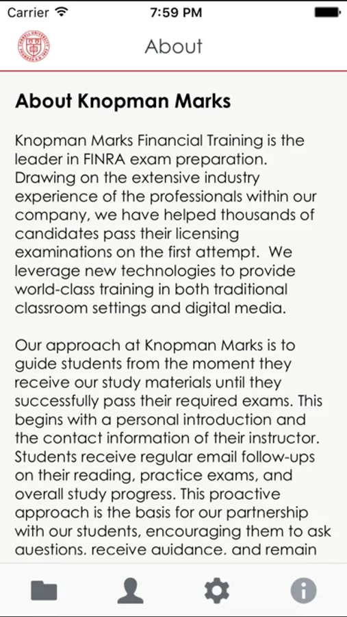 Cornell University offers students at Johnson Graduate school this dynamic tool for interview prep. The app contains hundreds of technical questions to help business students prepare for investment banking interviews. The content is brought to you by Knopman Marks, the leader in FINRA exam training. Knopman Marks trains thousands of investment bankers every year to pass their licensing examinations.