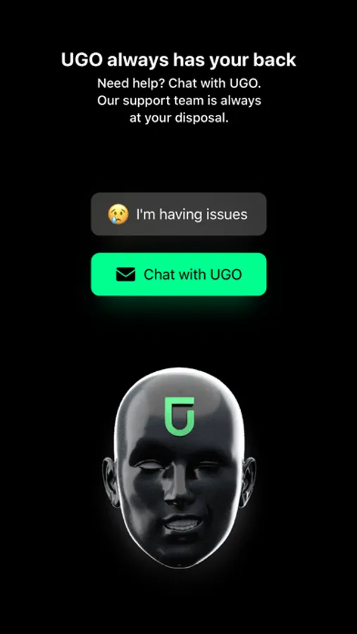 • UGO always has your back - Need help? Chat with UGO. Our support team is always at your disposal. Just get into the app and press [Chat with UGO] or [I'm having issues].