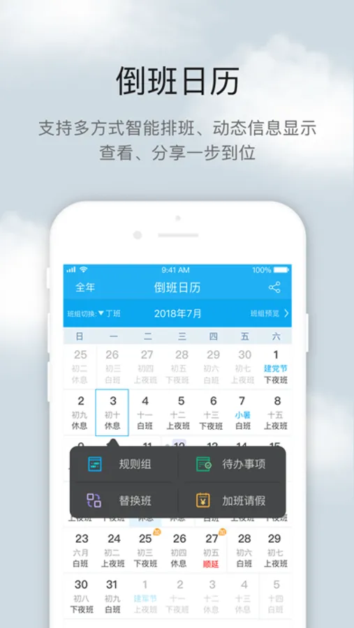倒班助手APP基于倒班规则、倒班闹钟的核心功能,为倒班人群提供天气查询、待办事项、倒班分享、班组切换等倒班人群爱不释手、需求量极大的功能,一经推出,便获得了用户的极大关注与认可。