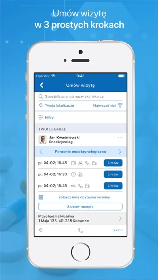- wyszukiwanie lekarzy, przegląd dostępnych terminów oraz umówienie wizyty lekarskiej (ogólnej i specjalistycznej)