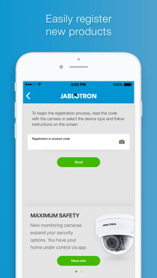 - Module for device registration to MyJABLOTRON: Simplification of the registration of supported devices to MyJABLOTRON by scanning the REG-KEY or the serial number with your mobile phone camera and entering a minimal amount of required information,