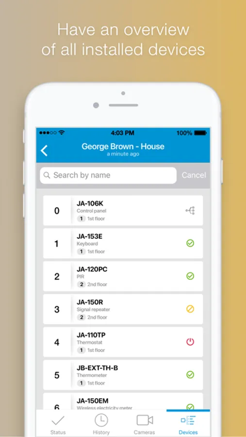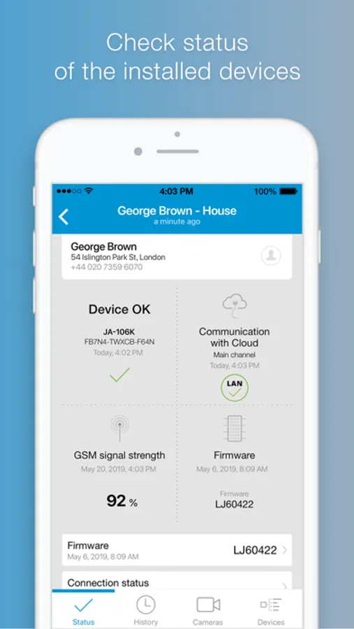 - Device administration module: A popular module that will allow an installer of Jablotron devices to carry out simple online diagnostics of devices, check their status, information about the HW and FW version, information about GSM signal quality, communication status and many more functions,