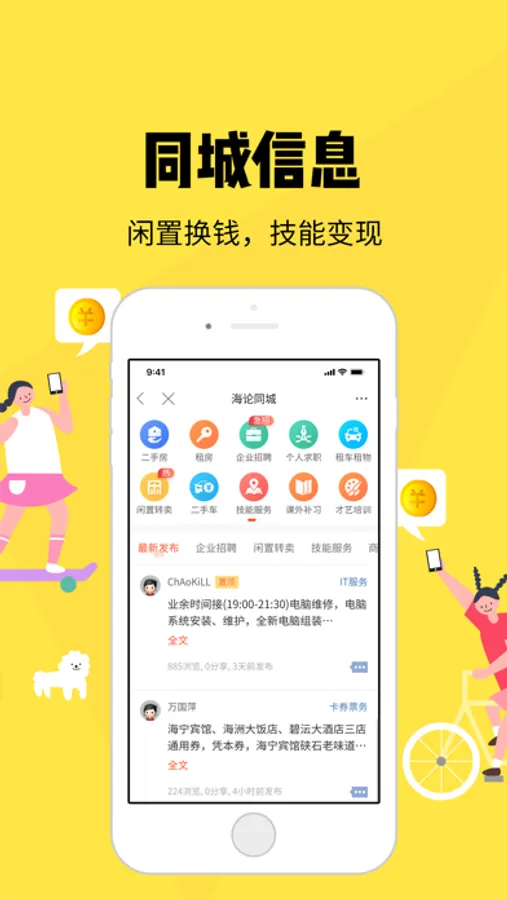 · 二手频道免费发布,同城面交更放心;新增“技能服务”频道,业余拥有各种特长的大神终于可以靠技能天赋赚钱啦。