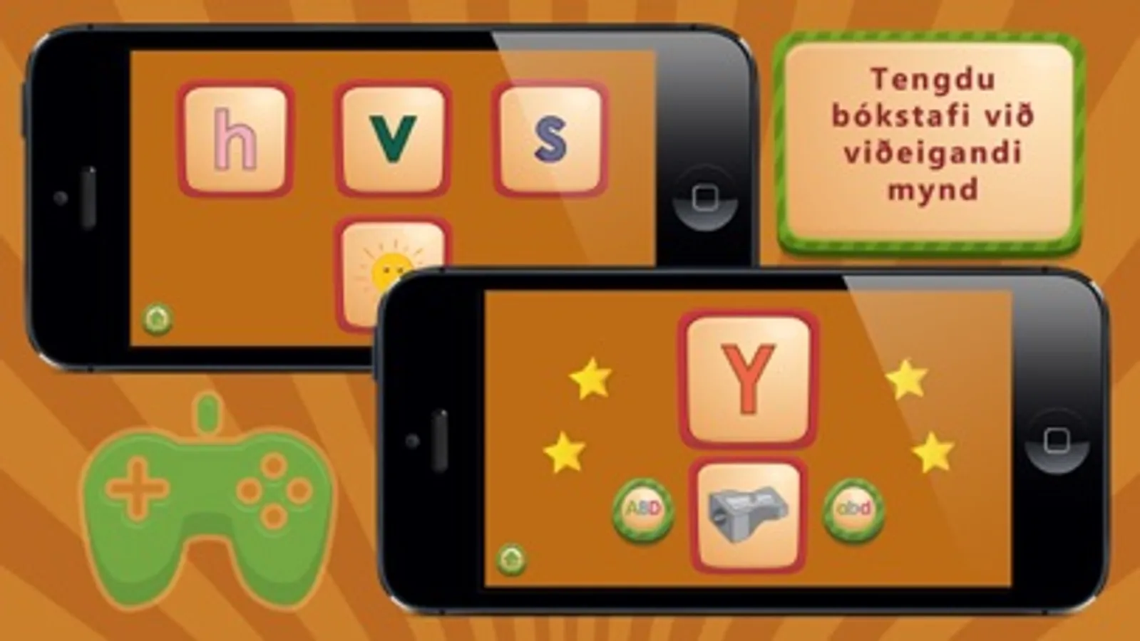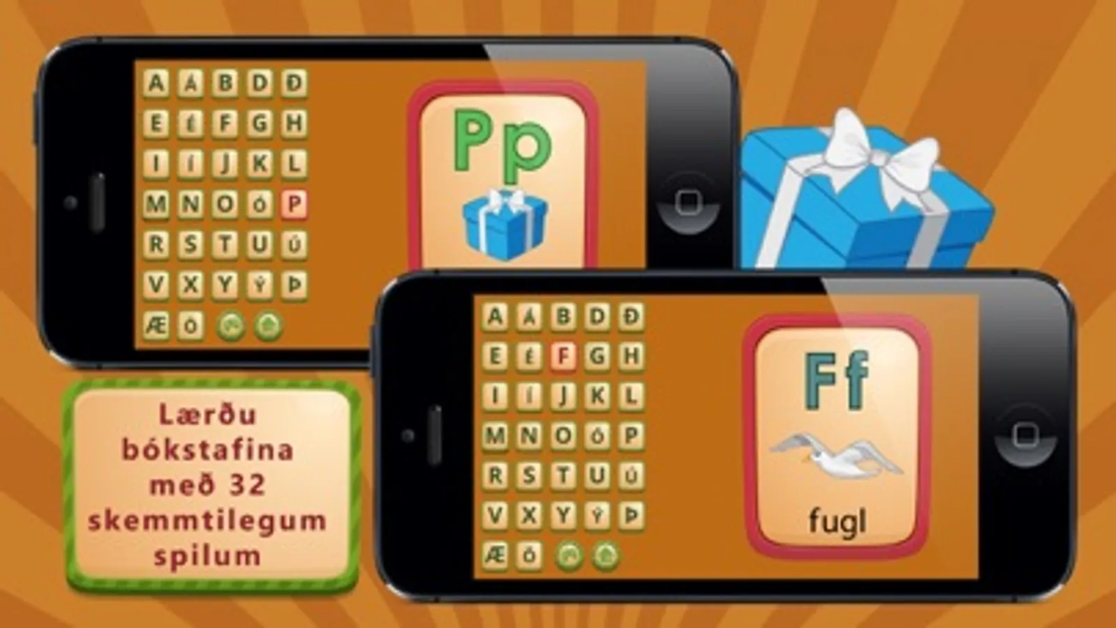 Forritið er með flottum spilum (flashcards) með bókstöfum og myndum sem börnin geta tengt við stafina. Nöfn hvers bókstafs eru upplesin ásamt skemmtilegum texta í tengslum við staf og mynd.