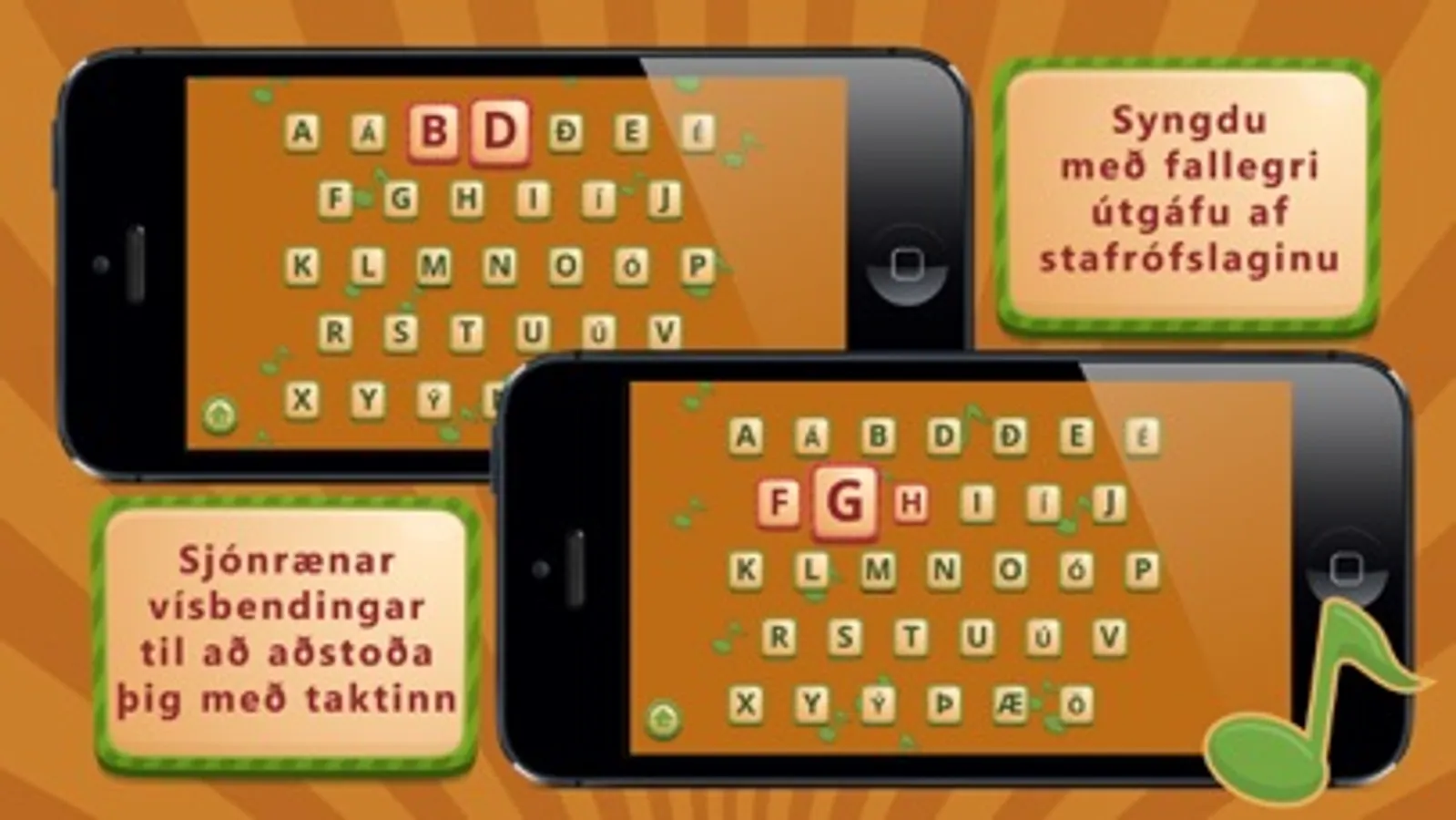 Síðast en ekki síst geta börnin sungið með Stafrófslaginu í fallegri útgáfu Einars Helga Þorsteinssonar. Lagið er með með sjónrænum taktmæli sem hjálpar til við að halda taktinum og muna hvaða stafur er næst.