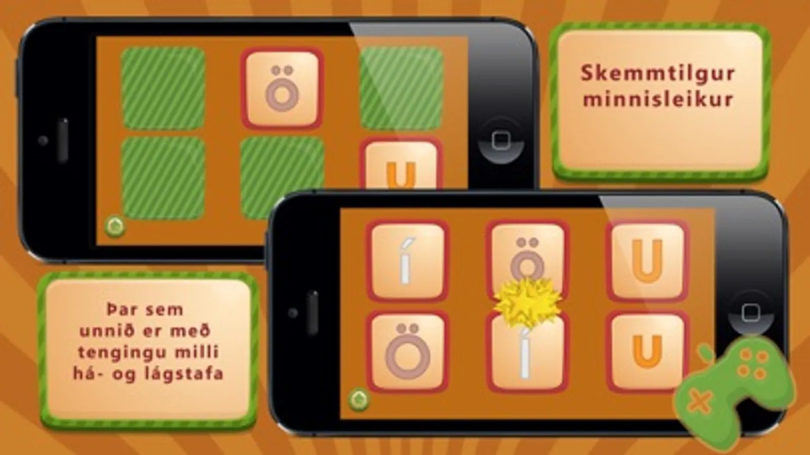 Þessu til viðbótar eru nokkrir samstæðuleiki til að þjálfa þekkingu á stöfunum á áhugaverðan hátt. Hægt er að æfa sig í að þekkja hástafi eða lágstafi í tengslum við mynd og nafn. Einnig er klassískur samstæðu minnisleikur þar sem á að tengja saman há og lágstafi.