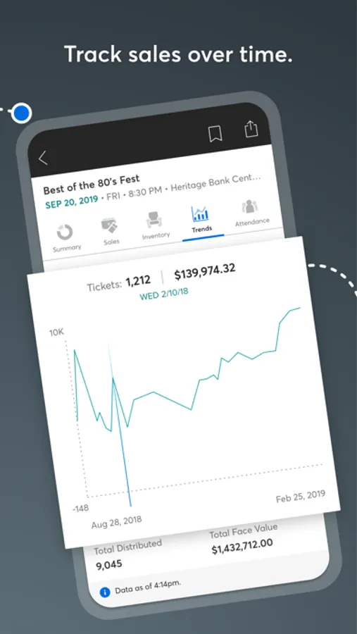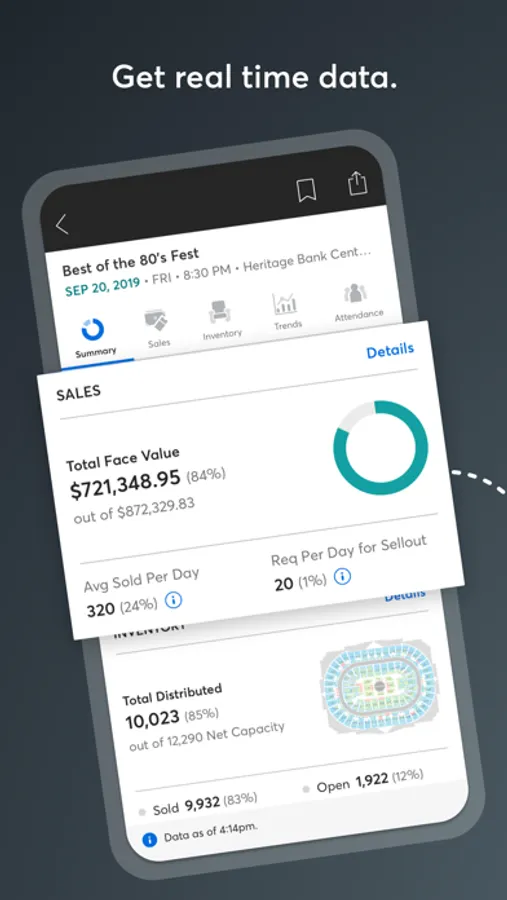 • Sales: Check sales revenue in real-time, including breakouts by price level and ticket type.