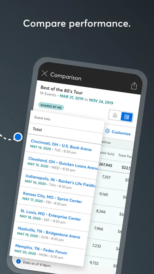 • Sales Comparison: Compare sales across more than one event, using either saved groups or the multi-select feature (tap Select Events in the list to get started).