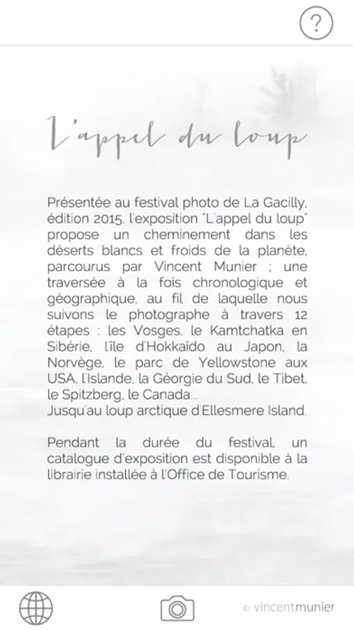 Cette application vous accompagne tout au long de l'exposition afin de découvrir des contenus supplémentaires associés à chacune des oeuvres du photographe. Chaque photographie est agrémentée d'informations et d'anecdotes narrées par Vincent Munier lui même, de vidéos réalisées sur le moment et de photo additionnelles.