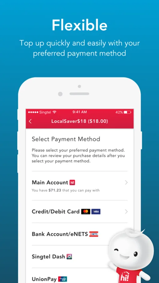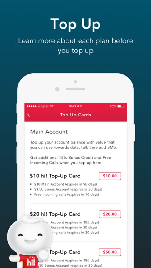 hi!App is the go-to place for all your Singtel Prepaid needs, anytime anywhere with no data charges! It is designed with you in mind - seamless interface for easier navigation, fuss-free management of your account, and more of the rewards you love!