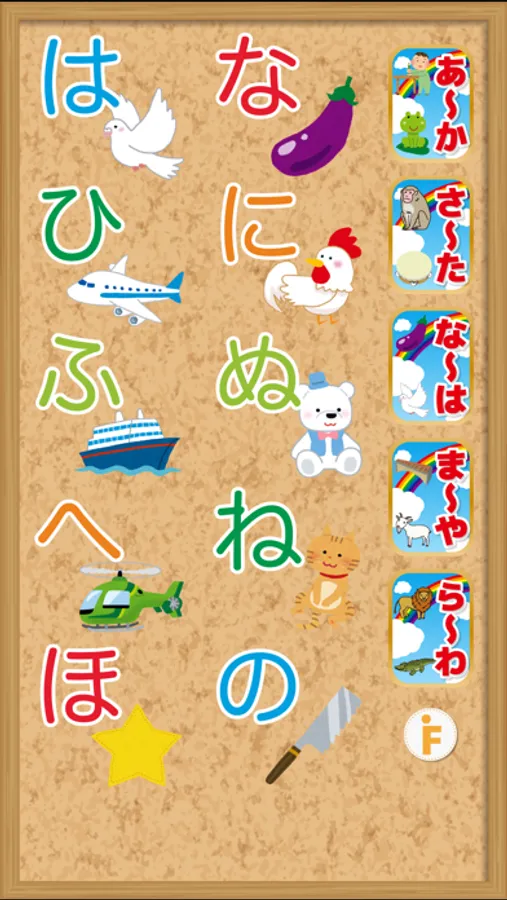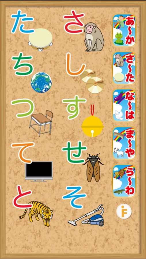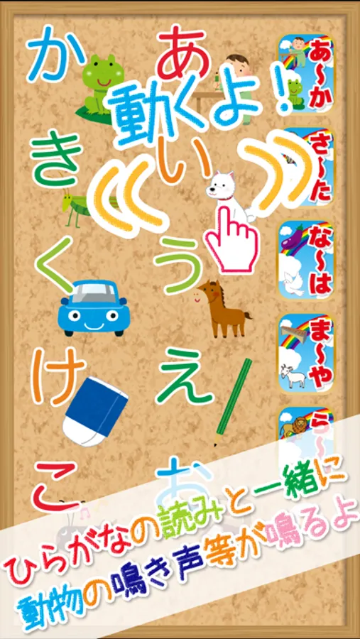 ひらがなをタッチすると、「あ あかちゃん」や「い いぬ」と再生され、音や動きを楽しみながらひらがなを覚えられる知育アプリです。