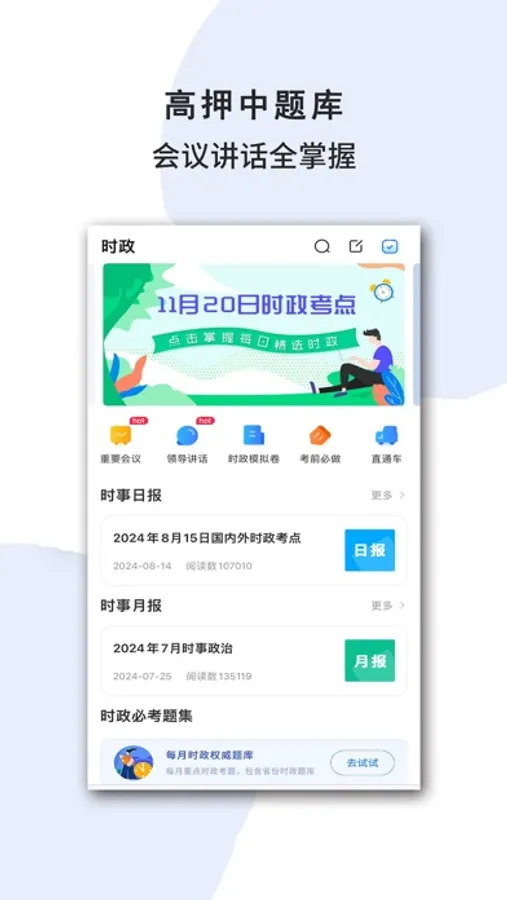 2、丰富时政资讯。时政日报、月报更新迅速,专业老师帮你划出重点,提升学习效率,还有时事专题、评论、会议讲话划重点等考试必备的资料,均可免费学习!