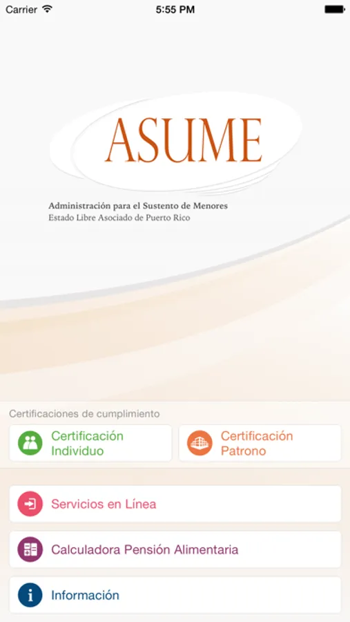 Conéctate - permite acceder a los servicios en línea de la ASUME o registrarse en ellos si eres participante de la agencia. Desde ahí puedes verificar los balances y pagos recibidos, obtener un historial de pagos, pagar la pensión alimentaria, obtener una certificación.