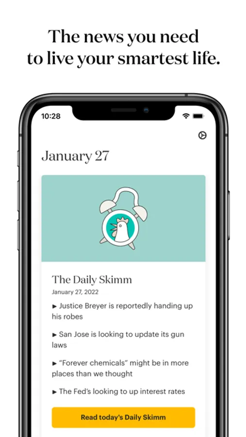 Meet: theSkimm app. We’ve got you covered on all the news and info you need to start your day. Think: news, podcasts, curated picks, and a personalized calendar to help you live your smartest life. Try the app for free. After that, pay less than a cup of coffee a month.