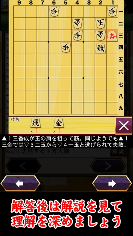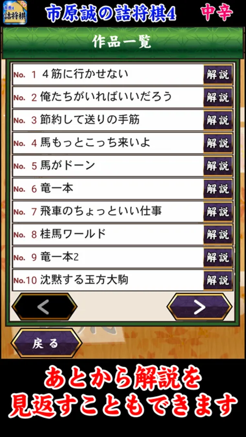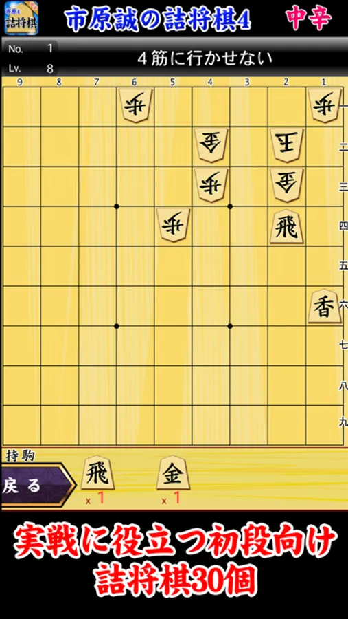 このアプリは市原誠氏によるスマホ詰将棋第4弾です。 今度は初段向けに9手詰11手詰オンリーの30作としました。
