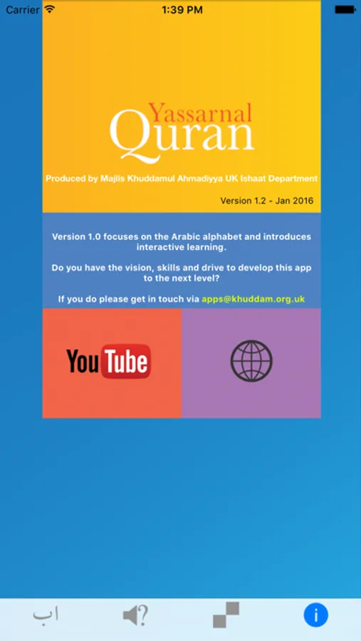The Yassarnal Quran applicaiton is a tool to help users learn to read the Arabic in the Holy Quran. The application has three interactive screens to assist learning as well as links to further resources.