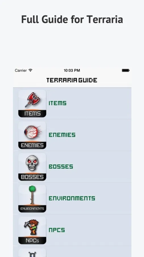 "Ultimate Guide for Terraria" contains a full strategy guide giving you tips and tricks on bosses, items, enemies,NPCs, mechanics,....