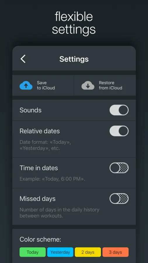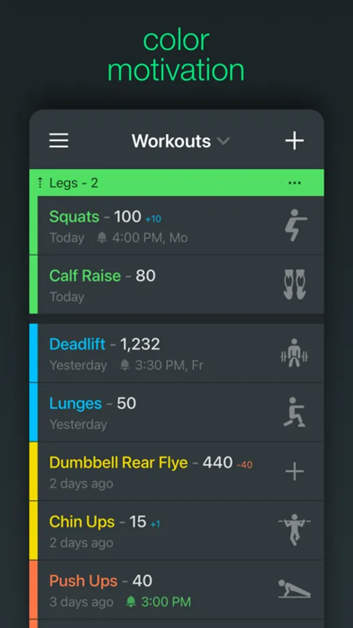 • Exercise colors automatically change depending on the date of the last workout, which is a unique feature that has a strong motivating effect. Don't let your exercises lose their color!