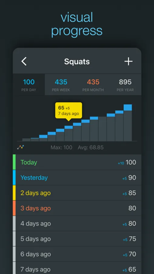 • History for days, weeks, months, and years for each exercise. You can see your progress over different periods of time and surely want to improve it!