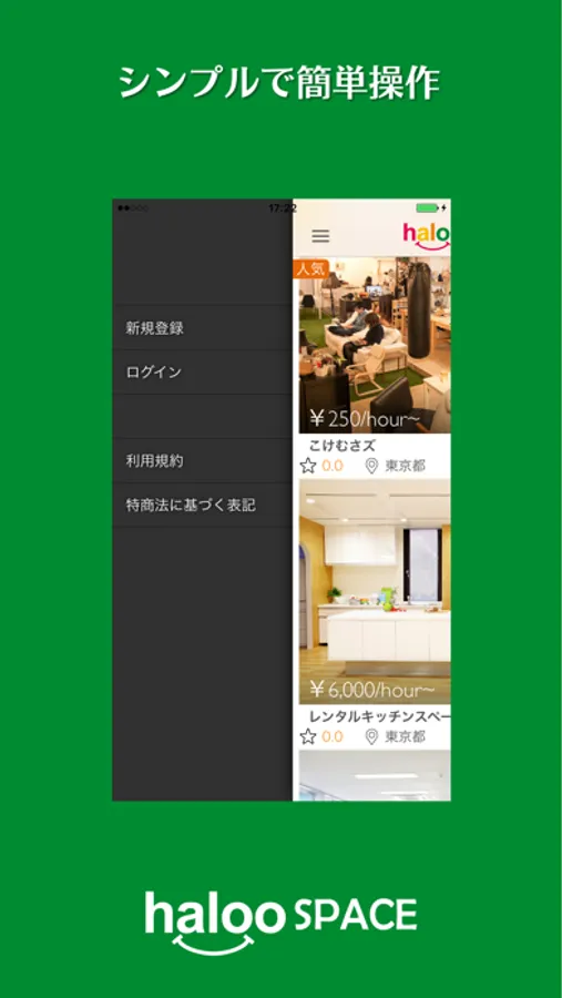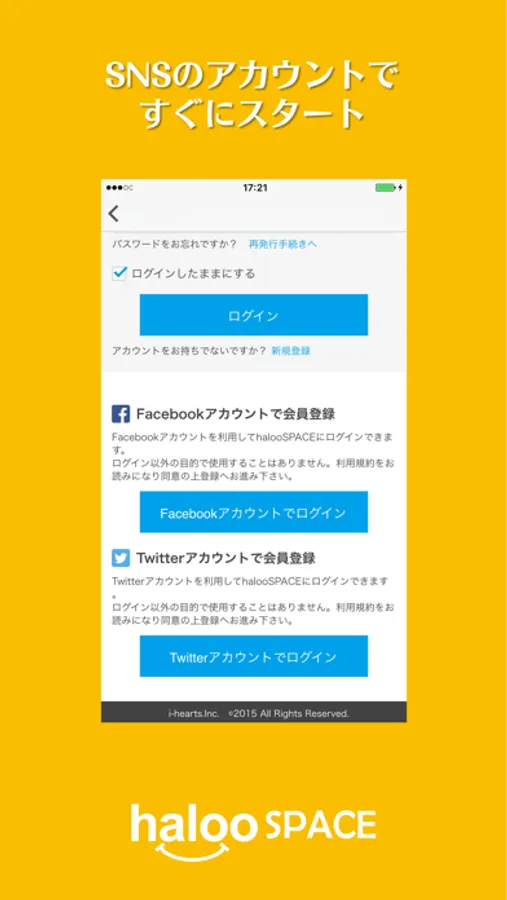 ユーザー登録はhalooSPACE独自アカウントの他にFacebook、Twitterでのログインも可能です。